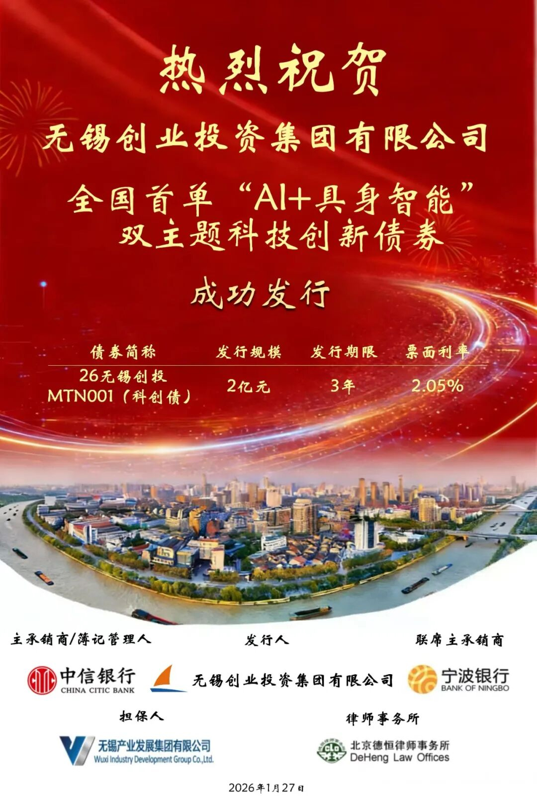 1月27日,全國首單同時(shí)聚焦“人工智能”與“具身智能”的主題科技創(chuàng)新債券在錫發(fā)行。無錫創(chuàng)業(yè)投資集團(tuán)有限公司成功發(fā)行2026年第一期中期票據(jù),規(guī)模2億元,集中投向人工智能與具身智能賽道。這是繼去年成功發(fā)行全國首批科技創(chuàng)新債券后,創(chuàng)投集團(tuán)再次運(yùn)用金融創(chuàng)新工具,精準(zhǔn)引導(dǎo)社會資本投向科技前沿,為無錫乃至長三角地區(qū)關(guān)聯(lián)產(chǎn)業(yè)發(fā)展注入動能。